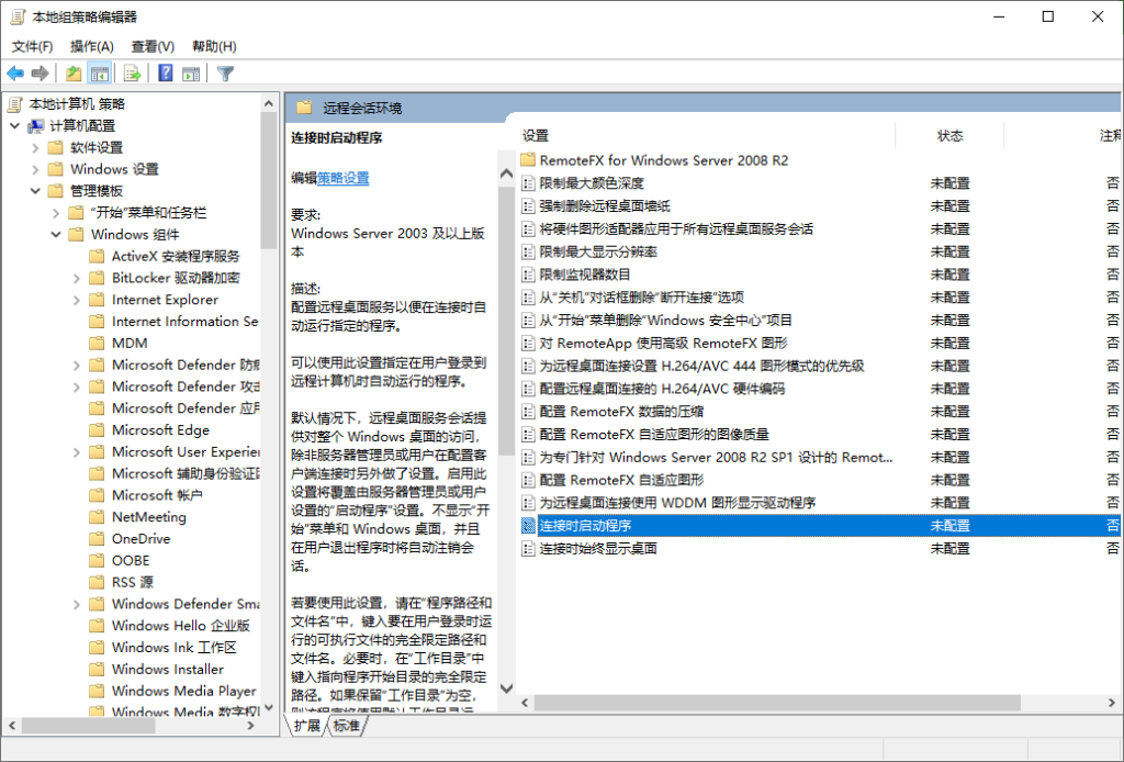 1、打开远程台式机上的组策略(Win键+R键打开运行,输入gpedit.msc),打开 计算机配置 --> 管理模板 --> Windows组件 --> 远程桌面服务 --> 远程桌面会话主机 --> 远程会话环境