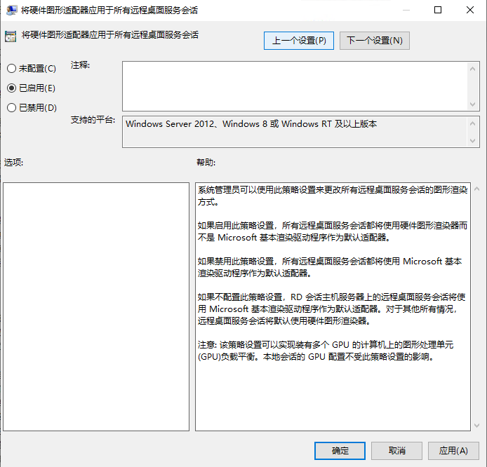 2、双击 将硬件图形适配器应用于所有远程桌面服务会话,勾选 已启用,点击 确定