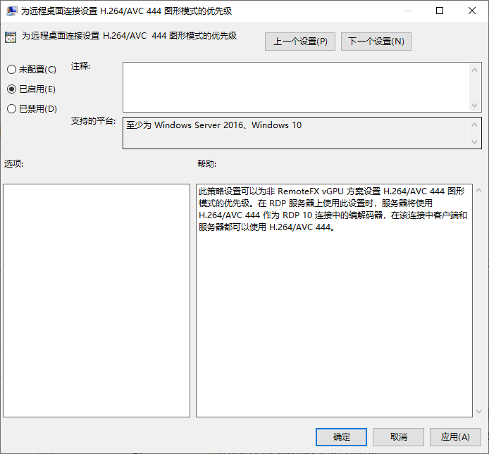 4、双击 为远程桌面连接设置H.264/AVC 444图形模式的优先级,勾选 已启用,点击 确定