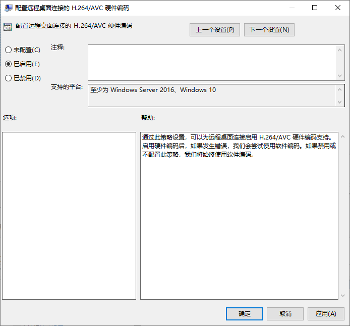 5、双击 配置远程桌面连接的H.264/AVC硬件编码,勾选 已启用,点击 确定