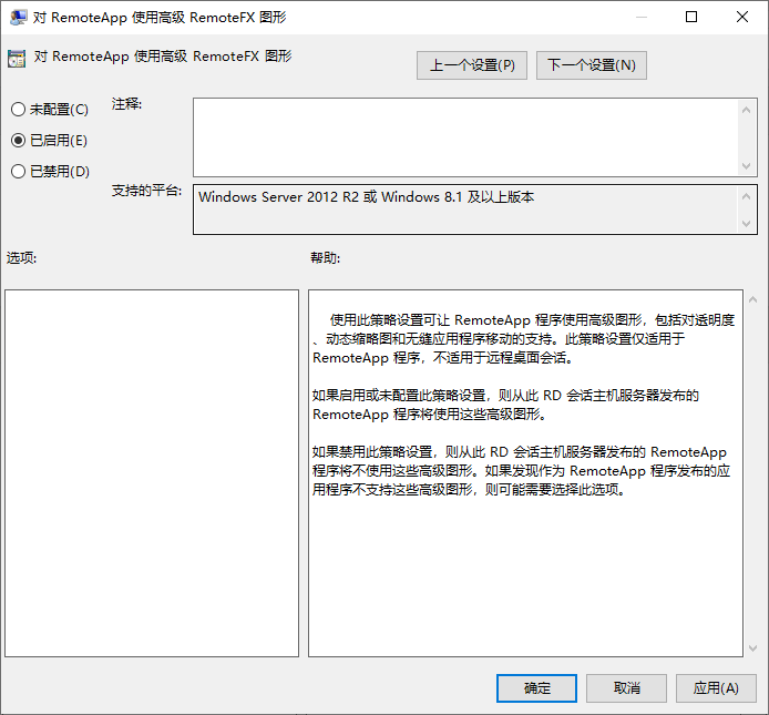 6、双击 对RemoteApp使用高级RemoteFX图形,勾选 已启用,点击 确定