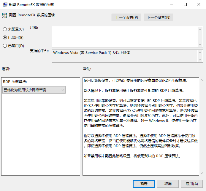 7、双击 配置RemoteApp数据的压缩,勾选 已启用,并将选项改为 已优化为使用较少网络带宽,点击 确定