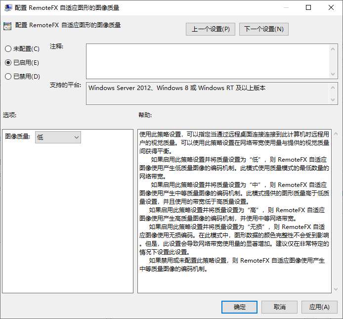8、双击 配置RemoteApp自适应图形的图像质量,勾选 已启用,并将选项改为 低,点击 确定