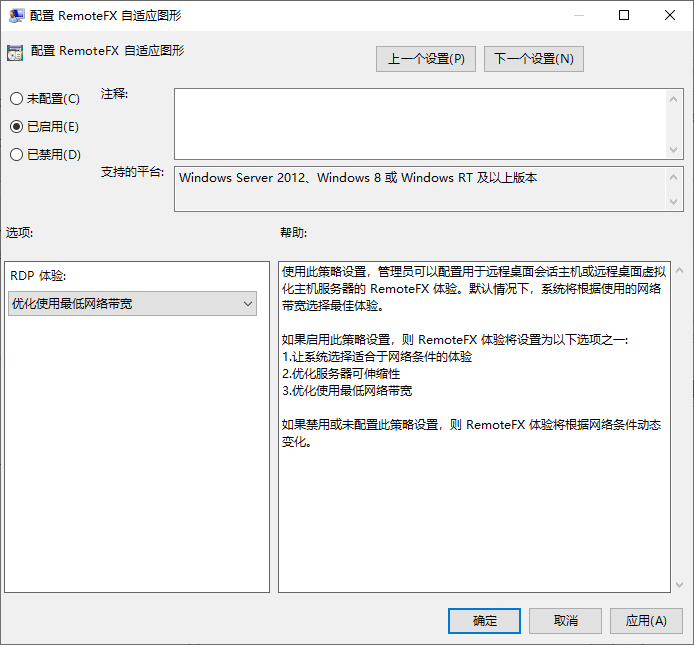 9、双击 配置RemoteApp自适应图形,勾选 已启用,并将选项改为 优化使用最低网络带宽,点击 确定