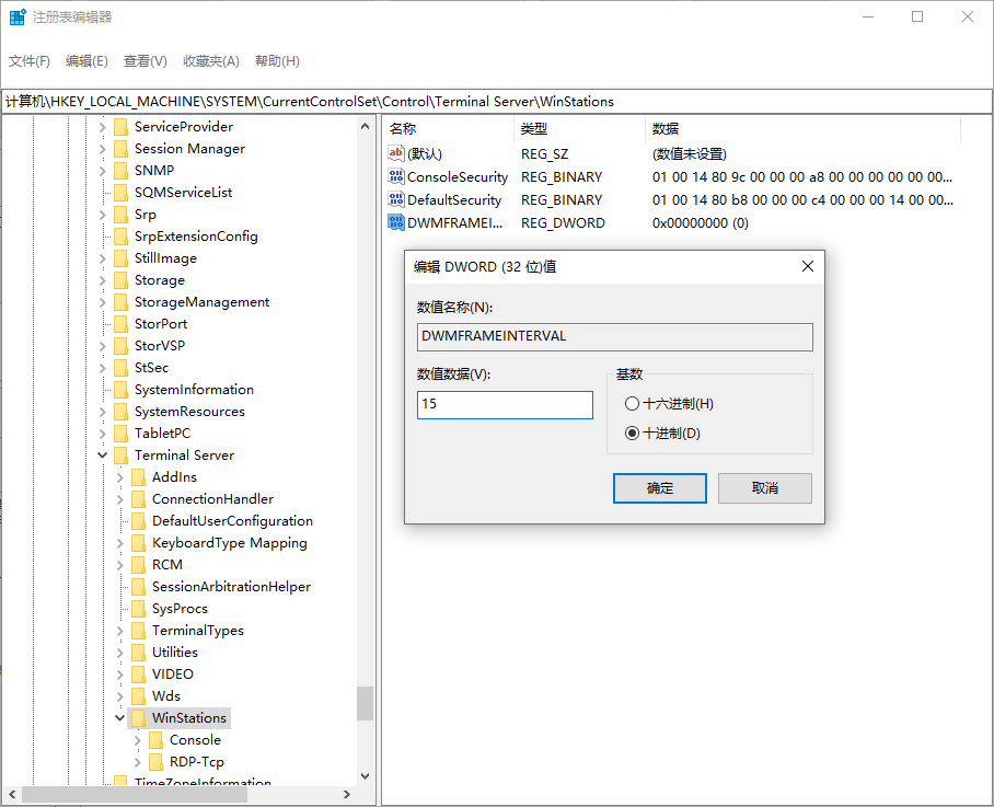 10、开启60帧传输,打开注册表(Win键+R键打开运行,输入regedit),打开 HKEY_LOCAL_MACHINE\SYSTEM\CurrentControlSet\Control\Terminal Server\WinStations ,新建 DWORD (32 位) 值,命名为 DWMFRAMEINTERVAL,选择“十进制”,值数据修改为 15,点击 确定